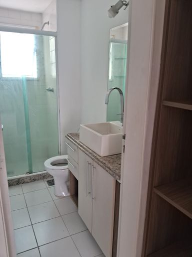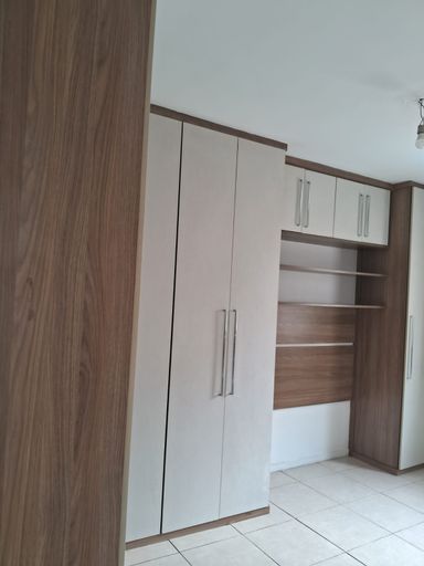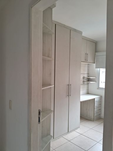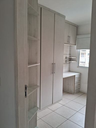 - Quartos: Cortina persiana, armário planejado com mesa de escritório