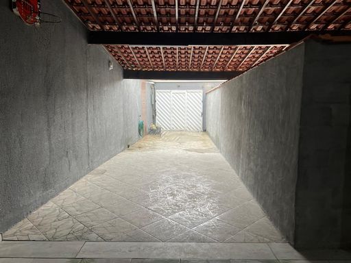 Casa Frente Linear: Garagem para 2 carros, varanda, sala, cozinha, 2 quartos, banheiro com Blindex, área de serviço e terraço espaçoso, em ponto de acabamento.