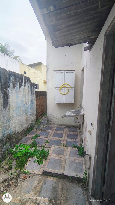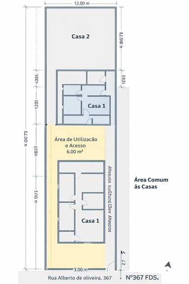 O terreno possui duas casas antigas, com acesso por corredor, sendo imóvel de fundos. Atualmente, uma das casas conta com varanda, sala, banheiro, dois quartos e cozinha.