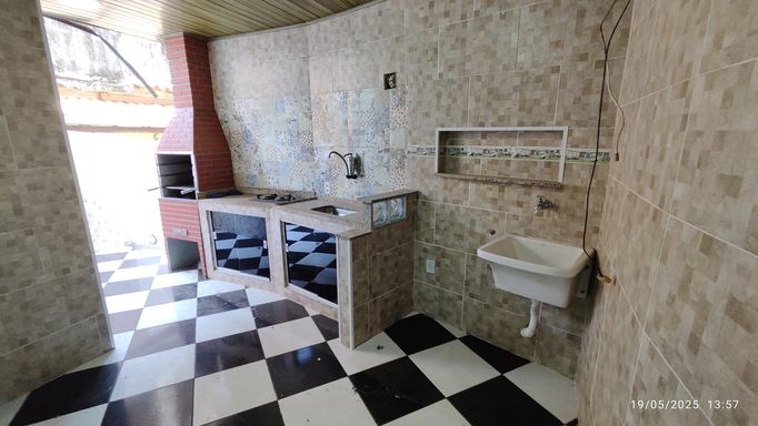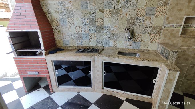- A área gourmet também conta com cooktop, pia em granito e portas em blindex, churrasqueira