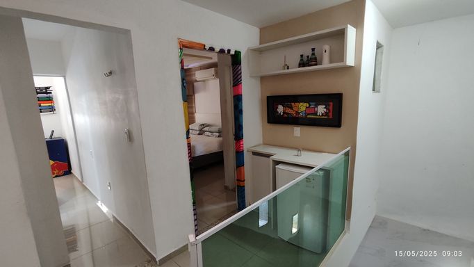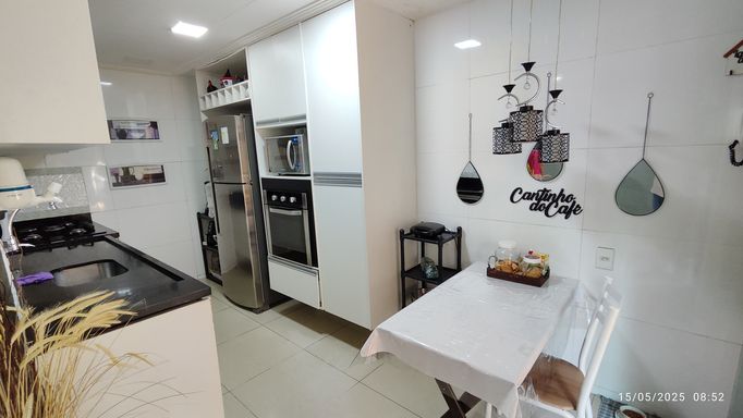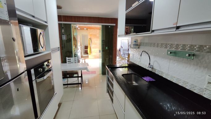 Casa Fundos Duplex: Garagem para 2 carros, varanda com área gourmet, sala grande, cozinha, 3 quartos (sendo 2 suítes), banheiro e área de serviço. Revestimento interno todo em porcelanato. Móveis planejados e ar condicionado inclusos na venda.